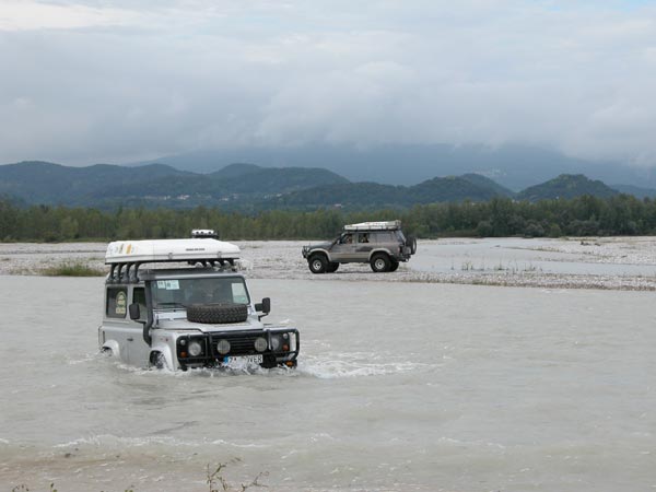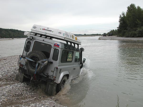 12 hod. - Tak dnes začala naše "plavba" Tagliamentem v počtu 8 teréňáků, dva ještě dorazí večer. Diskoška prošla právě vodním křestem.