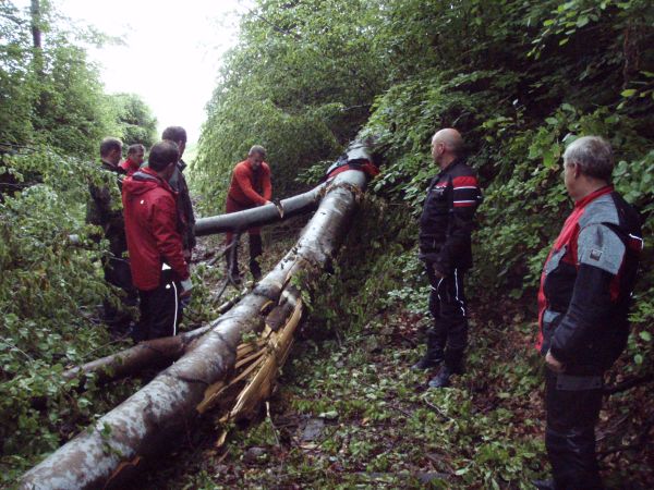 (nejstarší účstník 67) hodil bůček. Následovalo brodění nad jezerem Lesu. Při výjezdu na vyhlídku - ke kříži, nás zastavil padlý buk. Při jeho přejezdu se postavilo X-ko