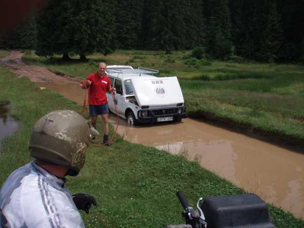 9.00 hod. - Tak jsme vzhůru, spát jsme šli ve 3.15 hod. Příjezd byl akční. Michala jsme s Transporterem tahal přes brdek na mokré trávě. Rumun Peter co u něj bydlíme na cabaně