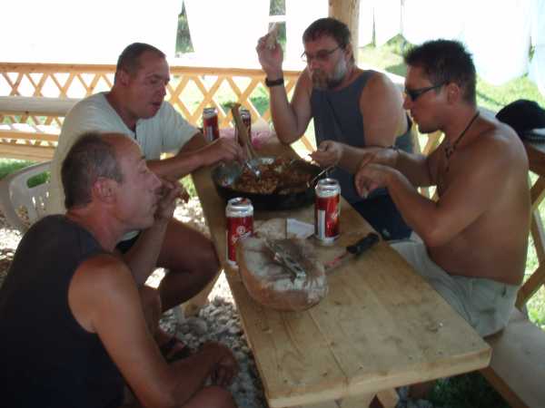 masovou pánev venku na grilu a spali v altánu na stolech. Ráno azuro a koupel pod jezem v tůni. V 11 hodin vyrazíme na čtyřkolky. Zdar Náča