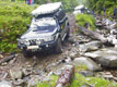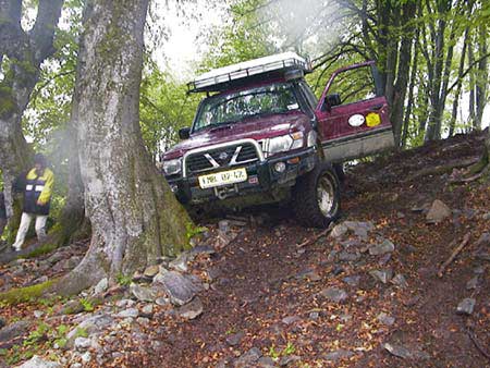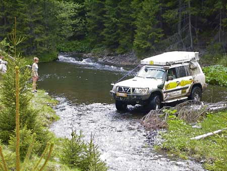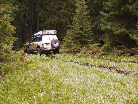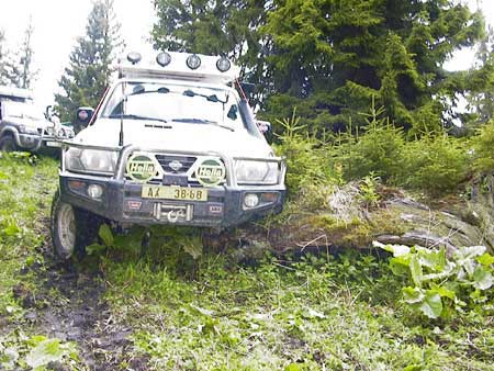 vpřed zastavuje o padlý strom - ještě že má Patrol tak robustní podvozek. Další info po